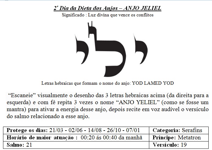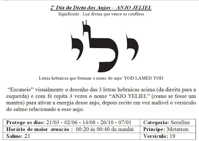 Hoje é o 2º Dia da Dieta dos Anjos, essa data é regida pelo Anjo Jeliel que nos traz a Luz divina que vence os conflitos