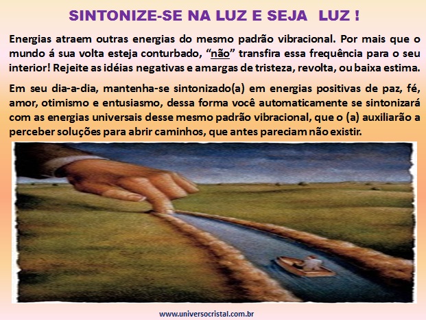 Seja grato(a) e atrairá essa mesma vibração á sua volta Ajude sempre que possível e quando precisar de ajuda estará sintonizado positivamente com essa frequência Perdoe e quando precisar de perdão, estará na sintonia de tb obter perdão Cultive o amor em sua mente, em sua alma e em seu coração e estará sintonizado(a) com as energias positivas da felicidade divina.